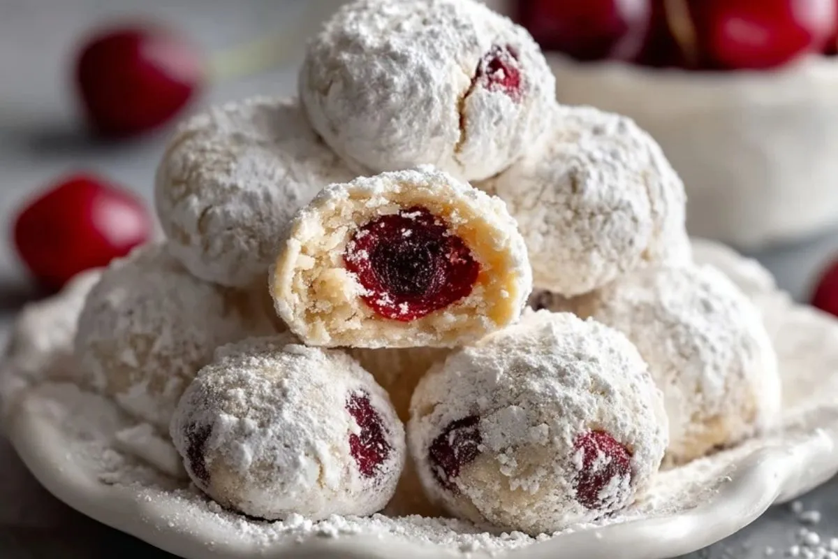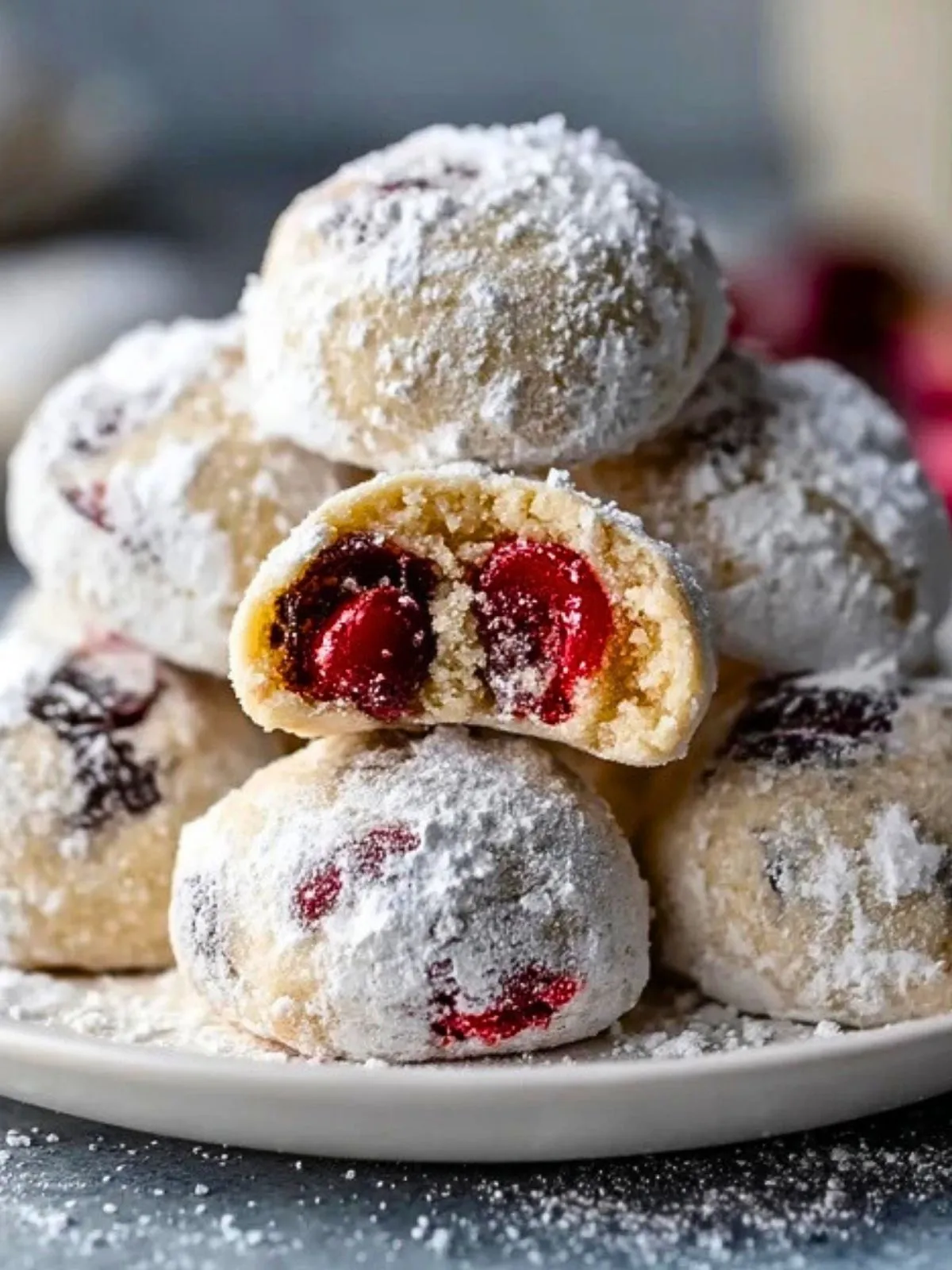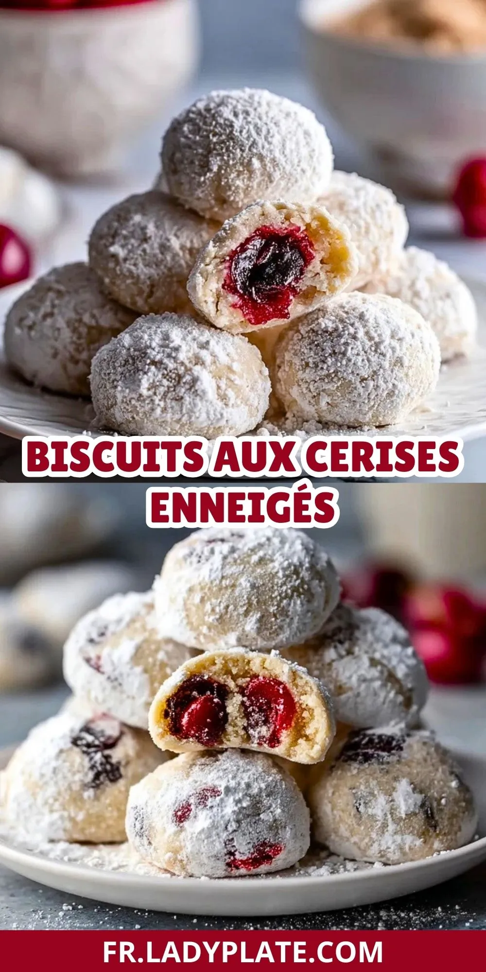 Ces biscuits aux cerises enneigés sont des petits gâteaux fondants et délicats, recouverts d’un généreux voile de sucre glace. Avec leur texture sablée, leur parfum de vanille et leurs éclats de cerises au cœur, ils sont parfaits pour les fêtes, les cadeaux gourmands ou un simple moment sucré avec une boisson chaude.