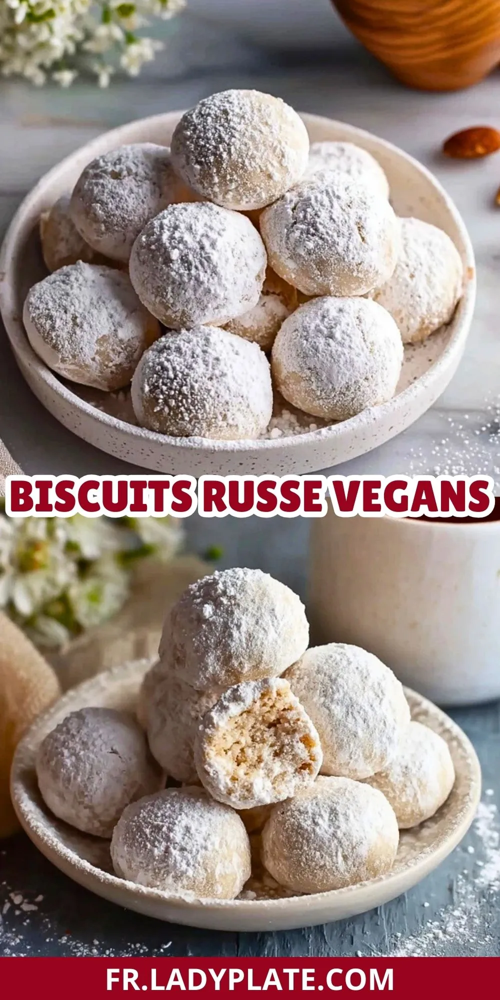 Ces biscuits russes vegans, aussi connus sous le nom de « boules de neige » ou « biscuits de Noël russes », sont de véritables petites douceurs à savourer à l’heure du thé ou pour offrir pendant les fêtes. Leur texture friable et fondante, enrobée d’un voile de sucre glace, évoque la magie hivernale et les traditions gourmandes venues d’ailleurs.