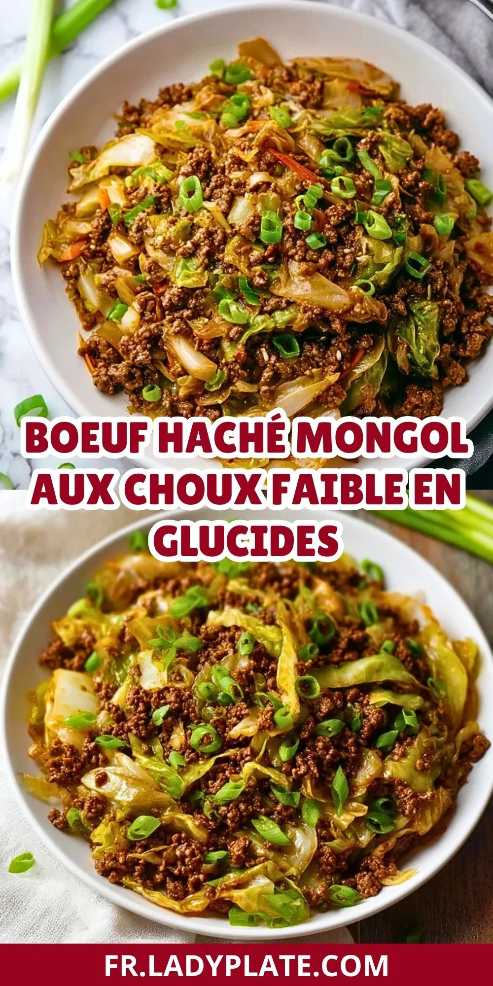 Ce boeuf haché mongol aux choux faible en glucides est un plat complet, savoureux et rapide à préparer, parfait pour les soirs de semaine où l’on veut bien manger sans passer des heures en cuisine. On y retrouve tout ce que l’on aime dans la cuisine asiatique maison : une sauce légèrement sucrée-salée, de l’ail, du gingembre, une pointe de sésame et beaucoup de parfum à chaque bouchée.