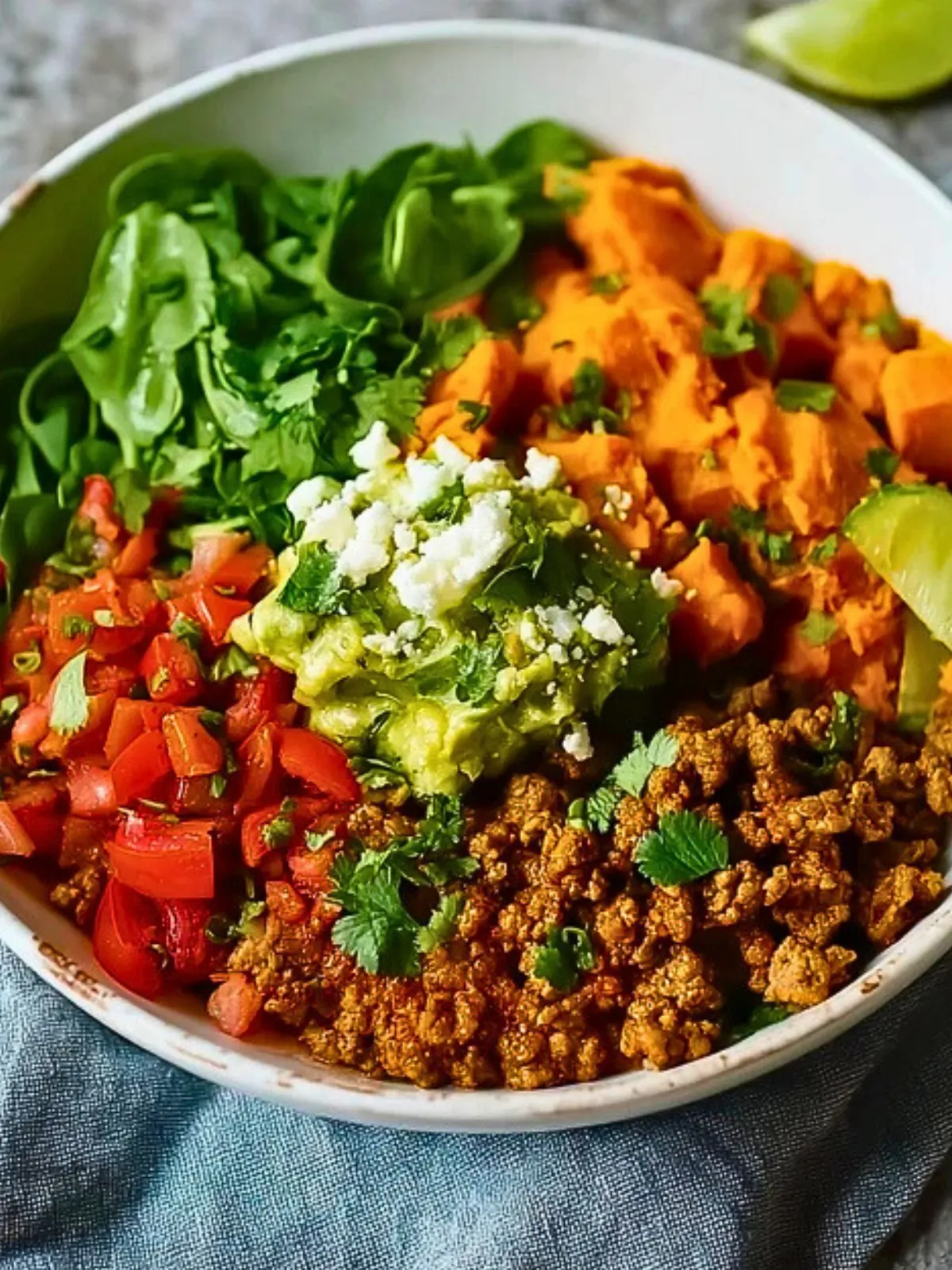 Répartissez la purée de patate douce chaude au fond de chaque bol. Ajoutez par-dessus une généreuse portion de dinde hachée épicée. Disposez ensuite les garnitures fraîches sur les côtés : lamelles d’avocat, dés de tomate, oignon rouge, légumes verts éventuellement sautés, fromage émietté et coriandre fraîche. Terminez par un filet de jus de citron vert juste avant de servir.