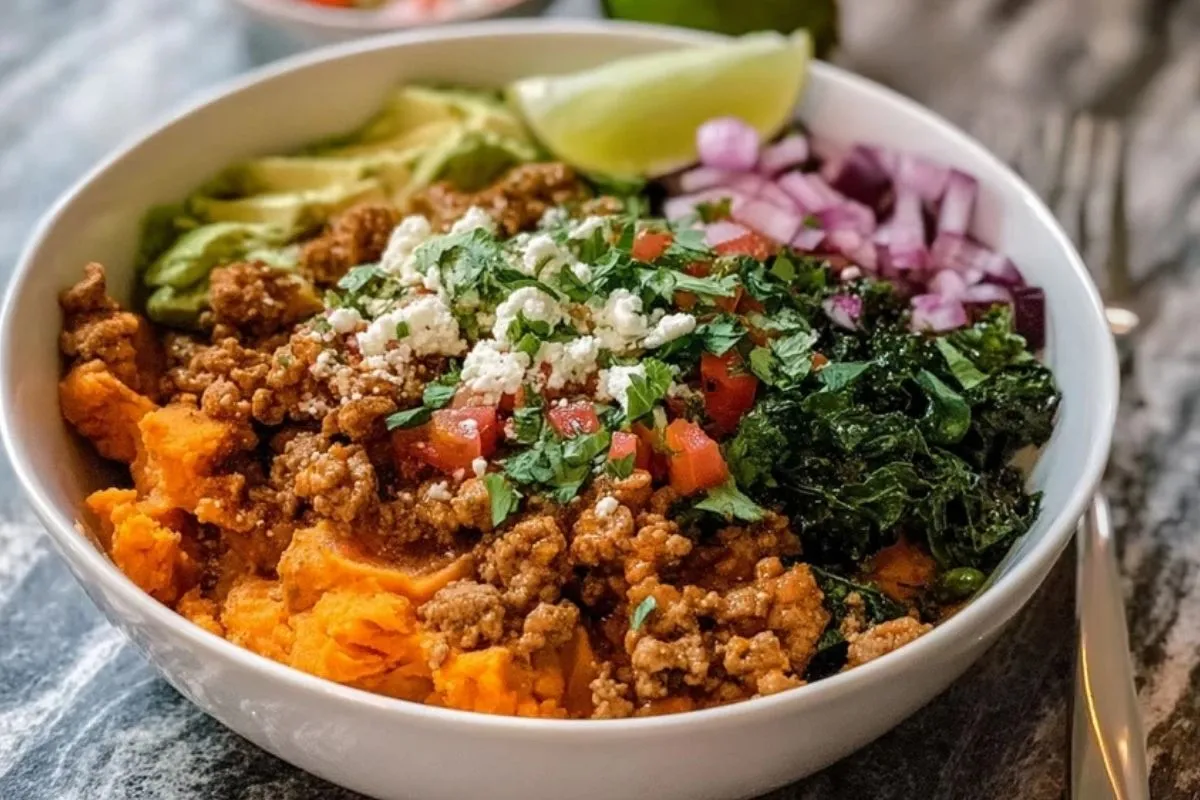 Un grand bol coloré, rempli de purée de patate douce, de dinde hachée parfumée aux épices, de légumes croquants et de fromage émietté… Ce bol de dinde hachée et patate douce délicieux est à la fois réconfortant et équilibré. Il combine la douceur naturelle de la patate douce avec le côté savoureux de la dinde et la fraîcheur des garnitures.