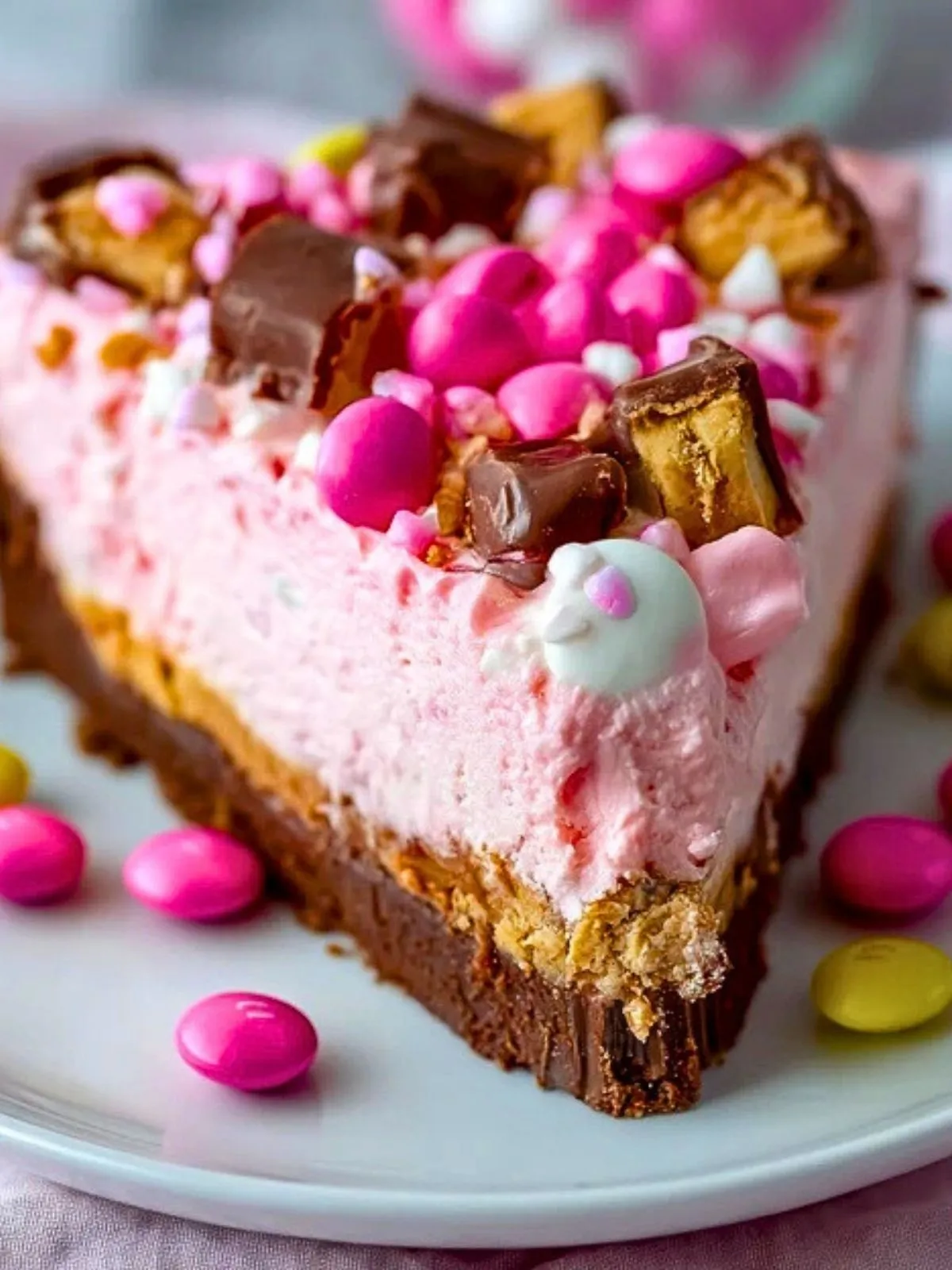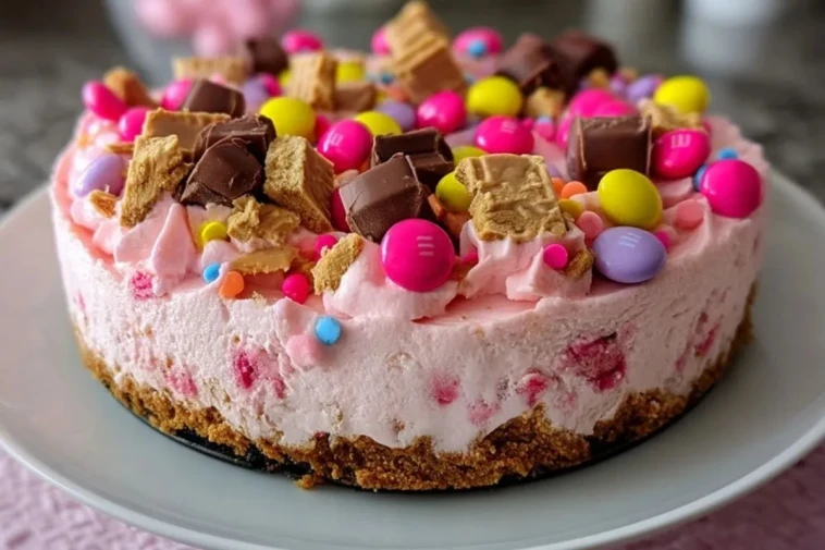 Keywords: cheesecake snickers rose aux m&ms, cheesecake sans cuisson, dessert festif, cheesecake bonbons, dessert anniversaire