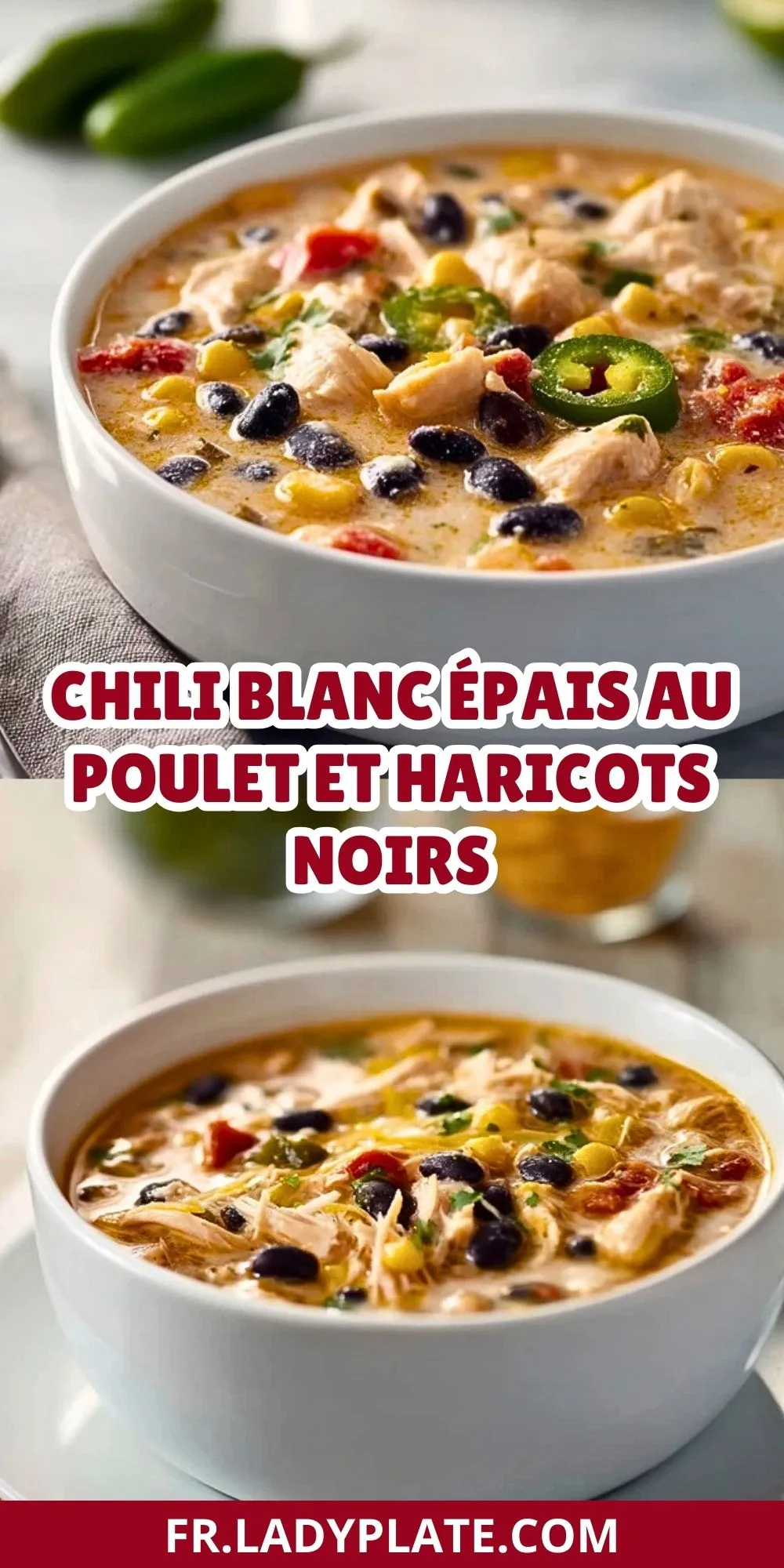 Ce chili blanc épais au poulet et haricots noirs réunit tout ce qu’on aime dans un plat généreux : une texture onctueuse, du poulet fondant, des haricots rassasiants et une belle profondeur de goût relevée sans être agressive. C’est une recette familiale, chaleureuse et très pratique quand on veut préparer un repas complet sans multiplier les préparations compliquées.