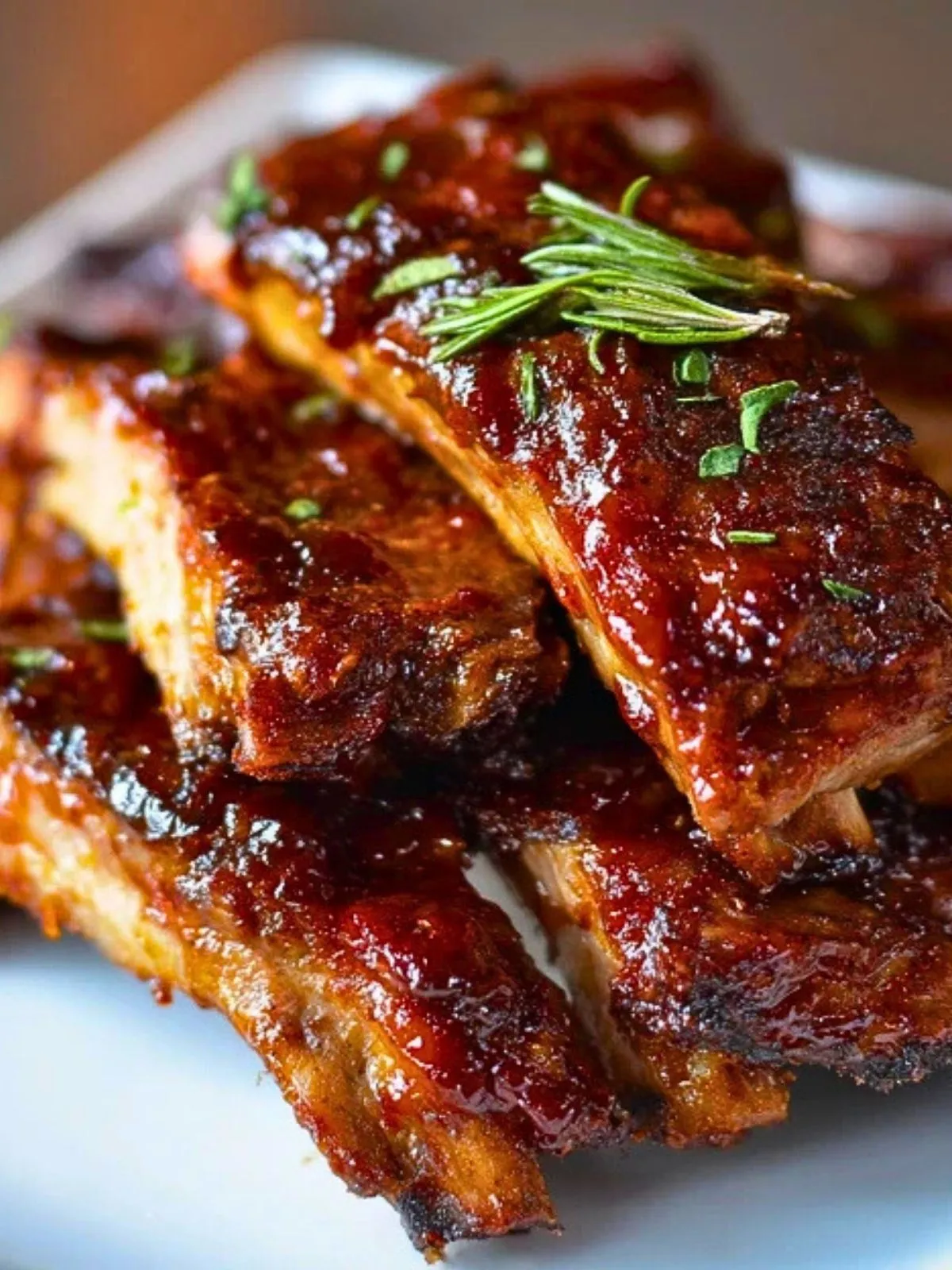 Transférez les côtes levées sur une planche et laissez-les reposer 5 à 10 minutes. Découpez ensuite entre chaque os pour obtenir de belles portions individuelles. Parsemez d’herbes fraîches avant de servir.
