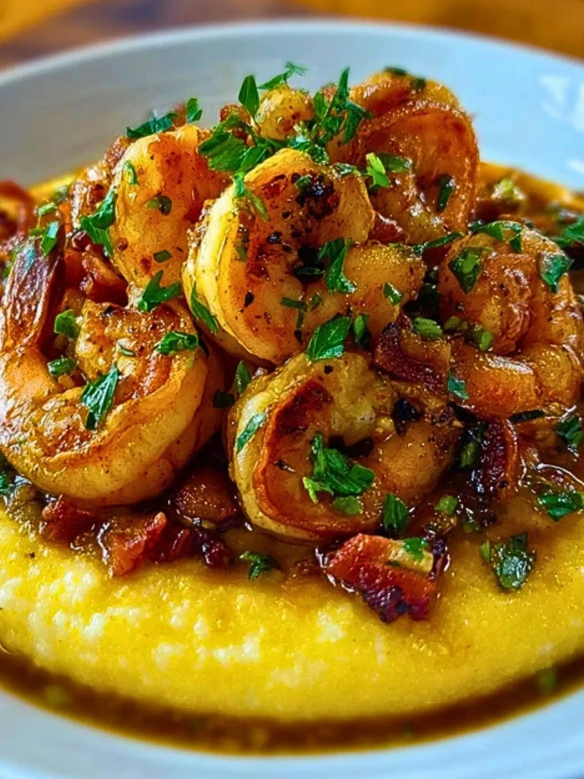 Des crevettes dorées et savoureuses servies sur une polenta crémeuse au parmesan composent un plat chaleureux et raffiné. L’alliance entre la douceur du maïs et la texture tendre des crevettes relevées d’ail et de paprika crée un équilibre parfait, idéal pour un dîner rapide mais élégant.