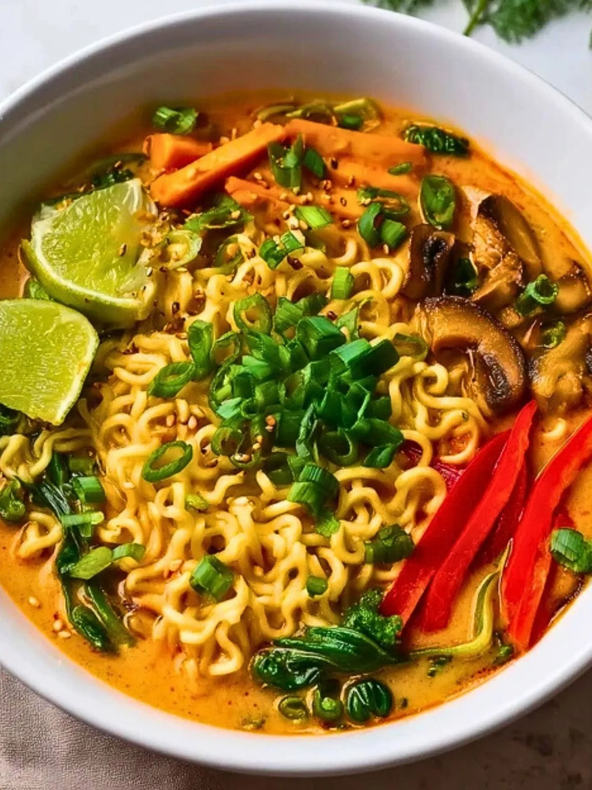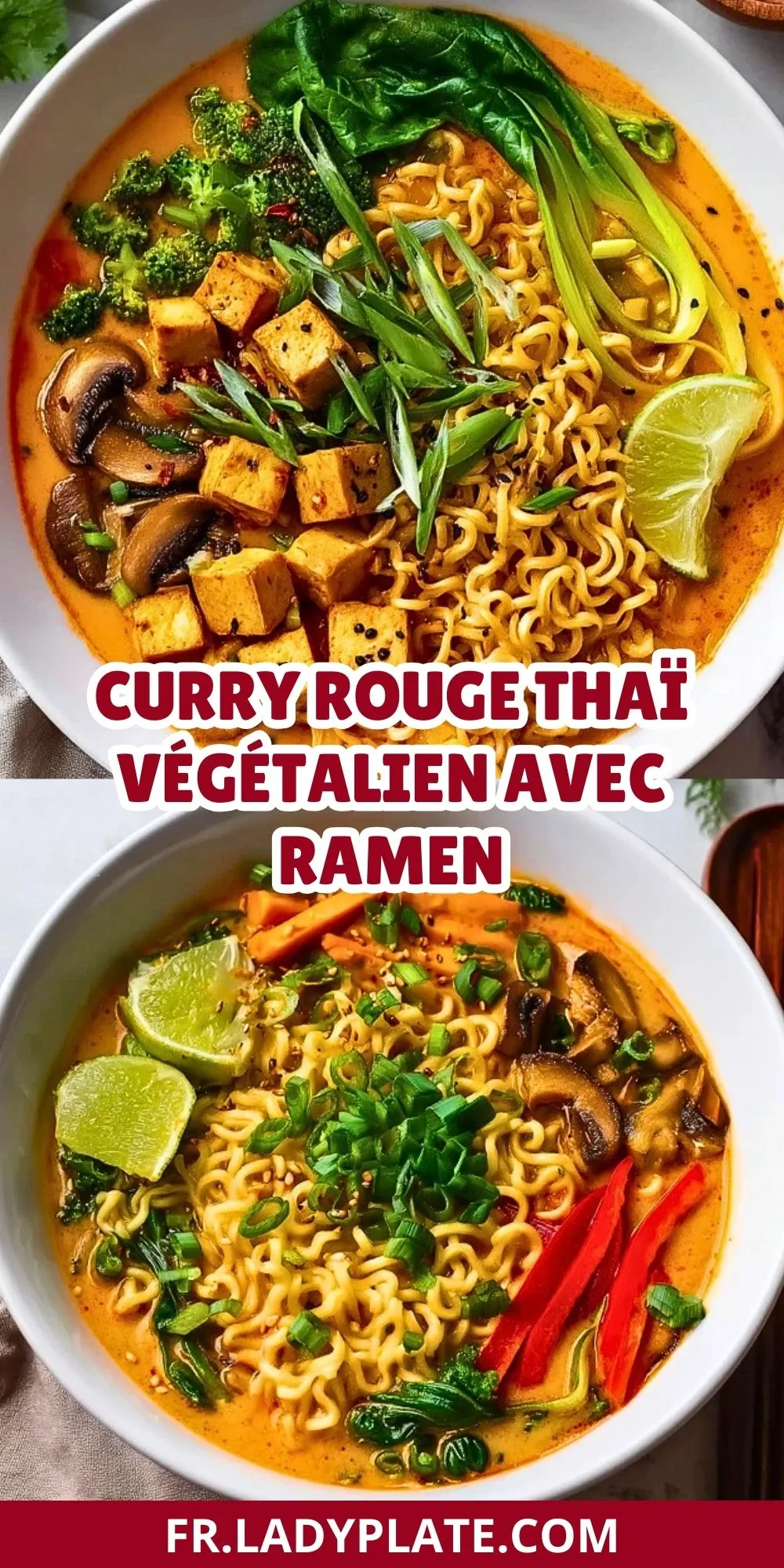 Un grand bol de curry rouge thaï végétalien avec ramen réunit tout ce que l’on aime dans un repas réconfortant : un bouillon parfumé, une texture crémeuse, des nouilles fondantes et une garniture colorée qui donne immédiatement envie de plonger sa cuillère dedans. C’est un plat généreux, relevé juste comme il faut, qui transforme des ingrédients simples en dîner vraiment satisfaisant.