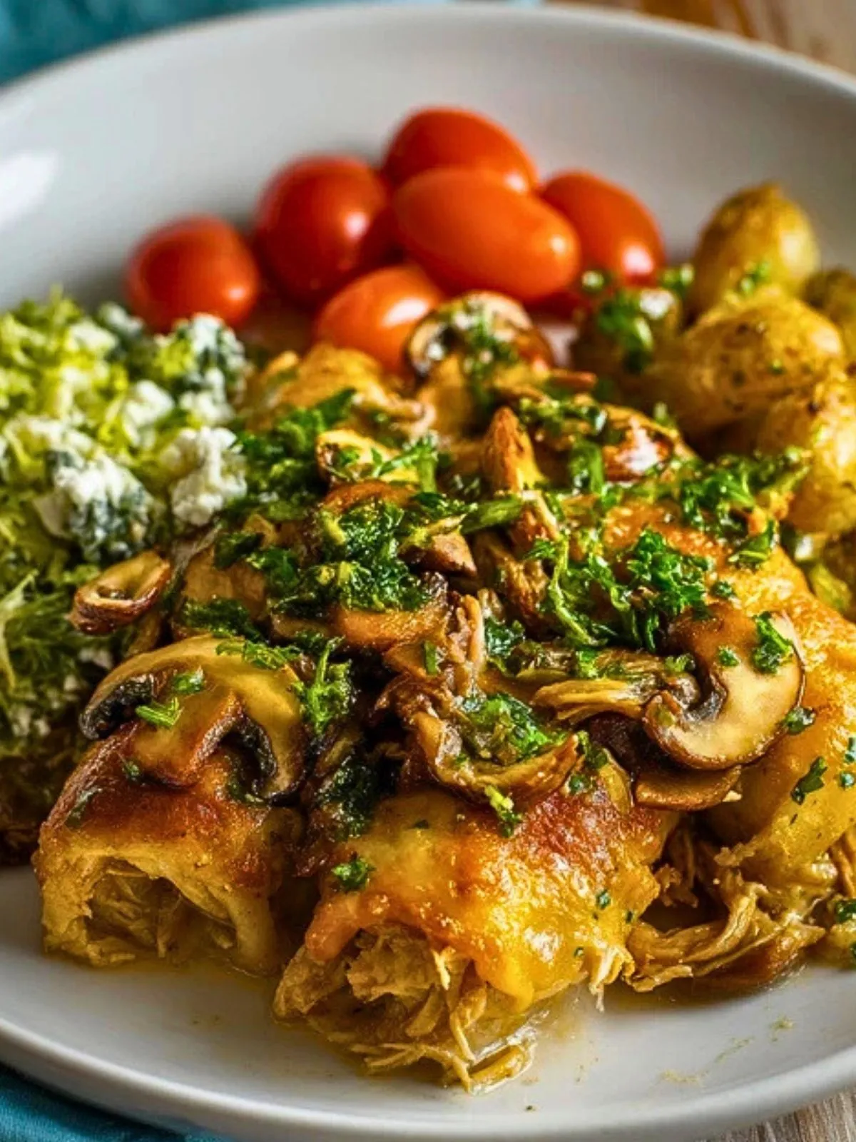 Servez ce dîner avec des restes de poulet dès la sortie du four, pour profiter du contraste entre les roulés chauds et la salade fraîche. C’est un plat complet qui se suffit à lui-même, mais vous pouvez l’accompagner d’une petite sauce au yaourt, citron et herbes pour encore plus de gourmandise.