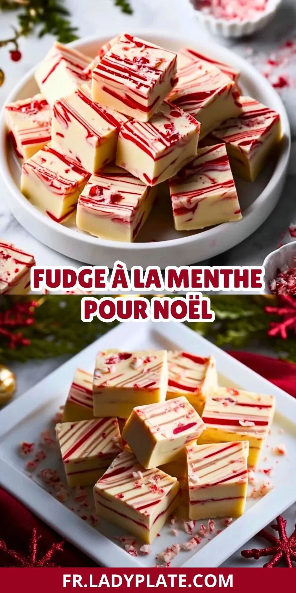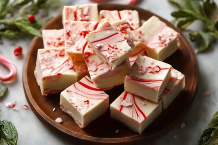 Carrés fondants de fudge au chocolat blanc et à la menthe, décorés de tourbillons rouges et de cannes de sucre d’orge. Parfaits pour offrir ou à savourer pendant les fêtes, ils séduisent petits et grands avec leur fraîcheur et leur douceur.