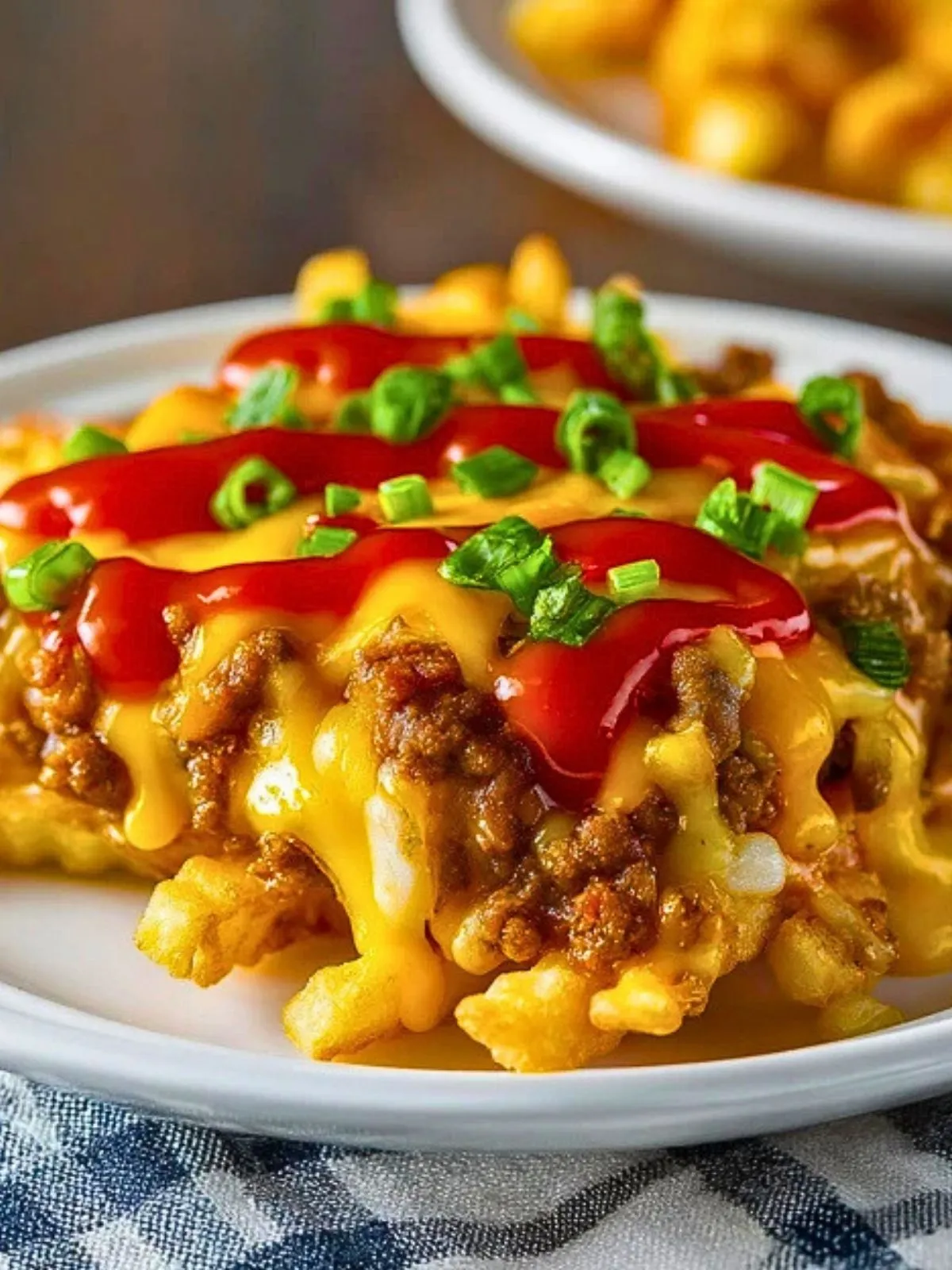 7. À la sortie du four, arrosez de ketchup en filets et parsemez d’oignons nouveaux finement émincés. Servez immédiatement tant que les frites sont bien croustillantes et le fromage fondant.