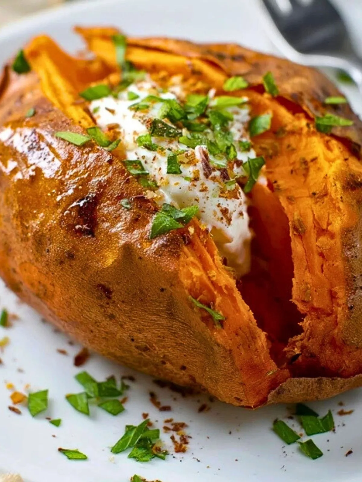 Une patate douce rôtie à la peau croustillante et à la chair fondante, simplement parfumée à l’ail et aux herbes fraîches. Le parfait accompagnement sain et gourmand, prêt en un clin d’œil.