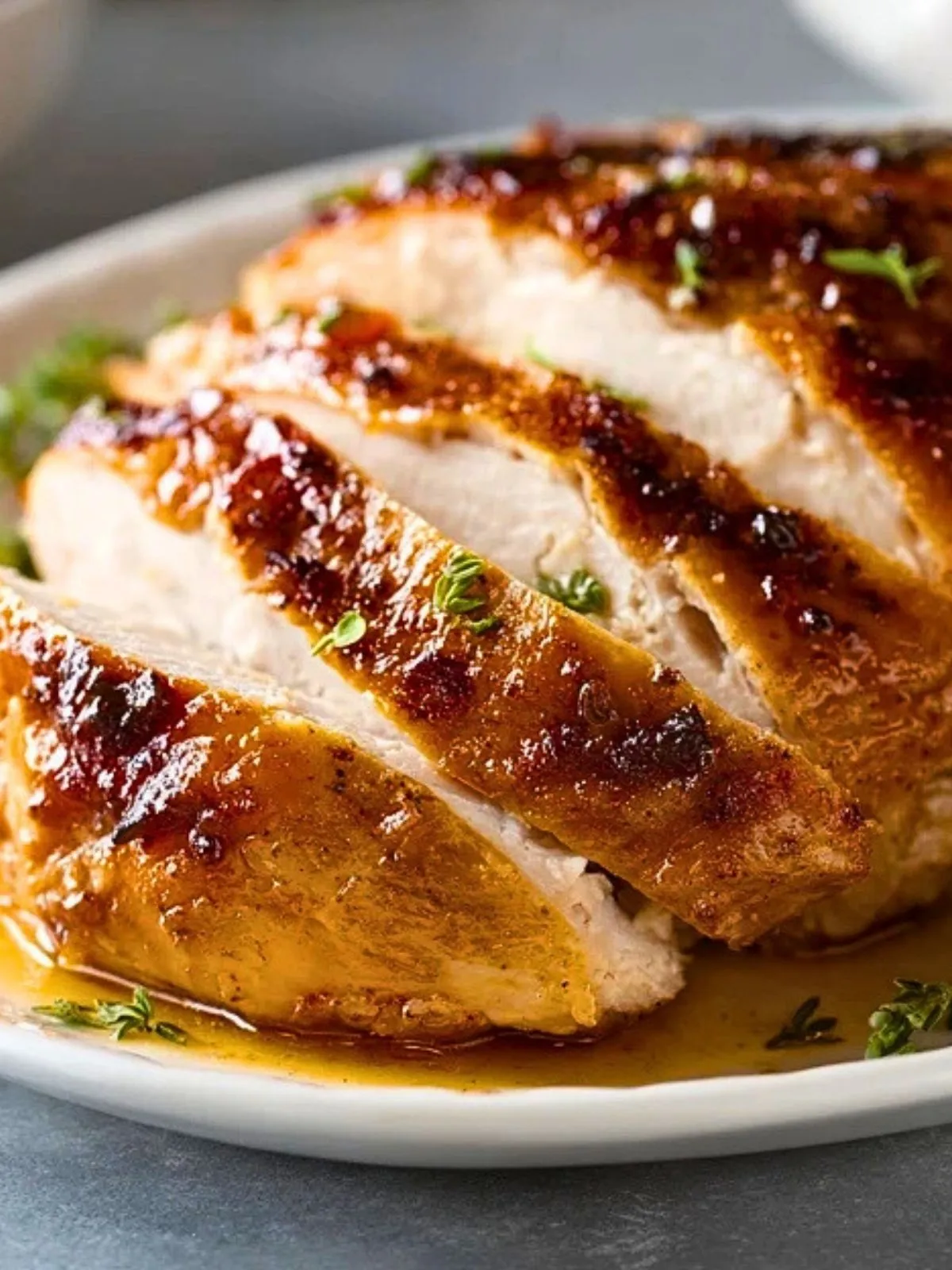 Pour un dressage de fête, disposez les tranches légèrement chevauchées sur un grand plat, ajoutez quelques branches d’herbes fraîches et arrosez d’un filet de jus. Proposez le reste du jus dans une saucière à côté.