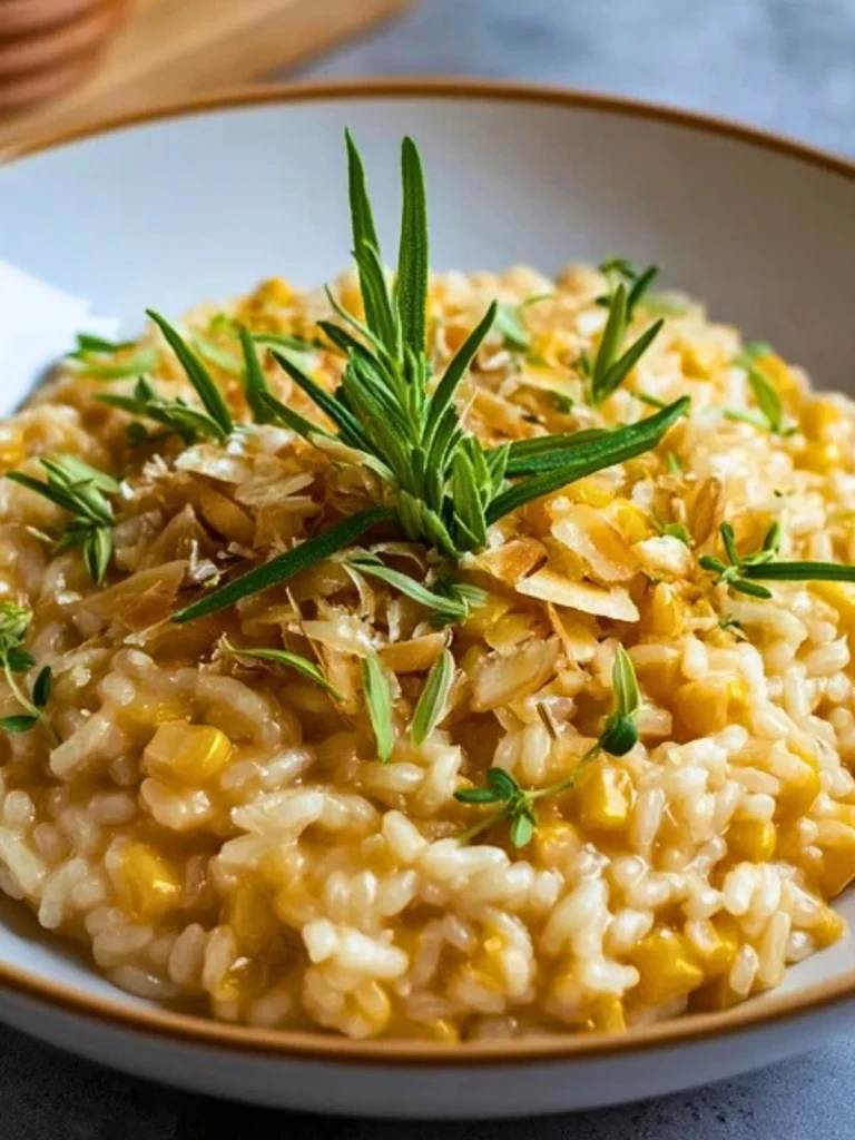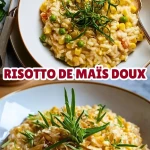 Un risotto végétarien crémeux, parfumé au maïs doux et relevé d’une touche de parmesan, parfait pour une entrée élégante ou un plat principal réconfortant.