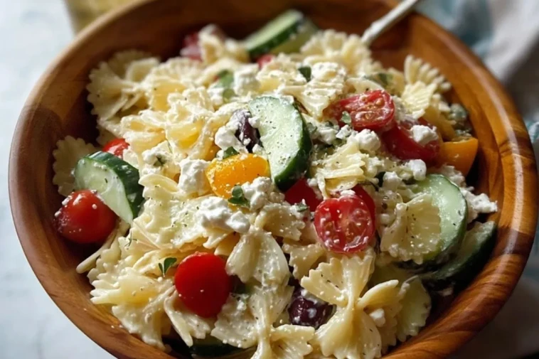 Cette salade de pâtes à la ricotta méditerranéenne associe des farfalle tendres, une ricotta crémeuse, des tomates cerises, du concombre, des olives et des herbes fraîches dans un assaisonnement citronné à l’huile d’olive. C’est une recette fraîche, colorée et facile à préparer, parfaite pour un déjeuner léger, un buffet d’été ou un repas à partager.