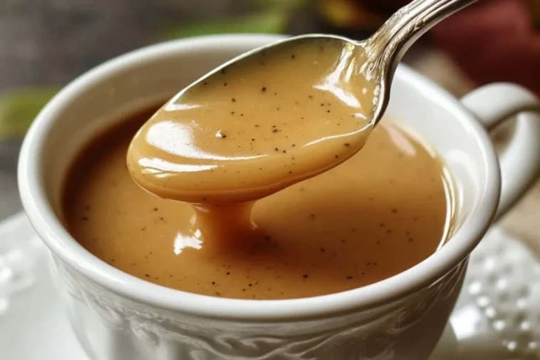 La sauce gravy maison est une sauce brune onctueuse, relevée et nappante, idéale pour accompagner viandes rôties, pommes de terre, purées ou légumes. Réalisée en quelques minutes avec du bouillon, du beurre et de la farine, elle apporte une touche festive à vos repas.