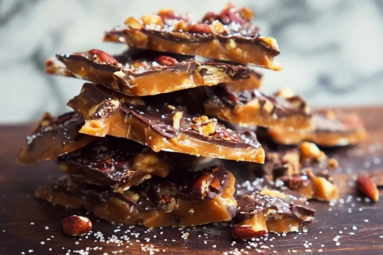 Toffee de Noël fait maison, au caramel au beurre croquant, nappé de chocolat noir fondant et parsemé d’amandes grillées et de fleur de sel, parfait à offrir ou à grignoter pendant les fêtes.