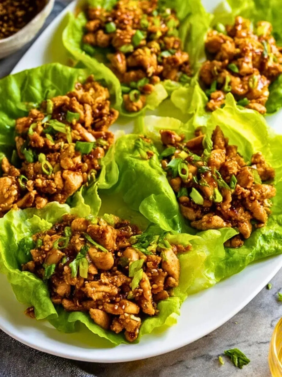 Ces wraps de poulet dans des feuilles de laitue sont un plat léger, frais et parfumé, parfait pour un dîner rapide ou un déjeuner sain, avec une garniture de poulet haché relevée d’une sauce asiatique légèrement sucrée et pimentée.